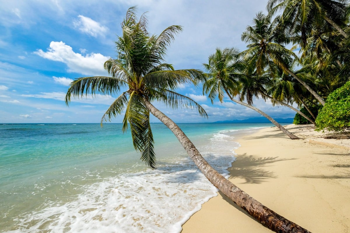 Pulau Karang (Coral Island) is a hidden gem in North Sumatra with perfect white sand and photogenic palm trees that hang over the turquoise water like a postcard.